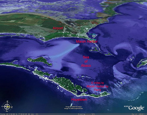 You fly into Marsh Harbor, Abaco by small twin engine airplane. It takes about one hour at low scenic altitude to fly over. Air fare as of August 2005 ranged from about $220. to $400. per person. The planes of some of the smaller airlines seat about 6 to 8 passengers. The airlines encourage you to travel light with a total baggage weight of no more than 40 pounds! The good news is that dress on the island is casual, shorts, shirts, sandles and bathing suits for the most part. More about dress and packing suggestions in the ISLAND FAQ. Some of the airlines that serve the area include: